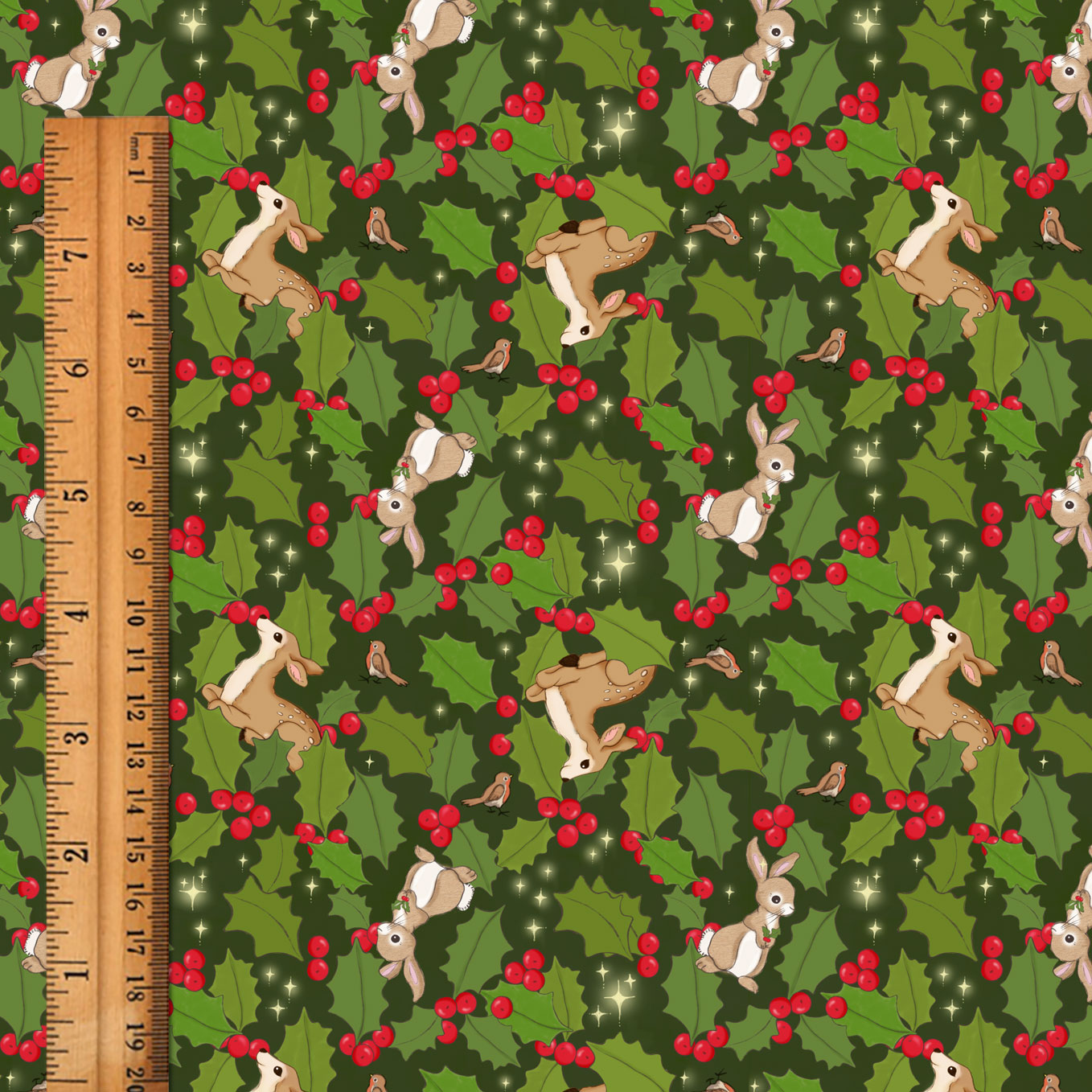 Illustrations of Boo Bunny and his deer friend are tossed amongst an all over Christmas holly and star pattern, on a green background, making it an ideal festive fabric.